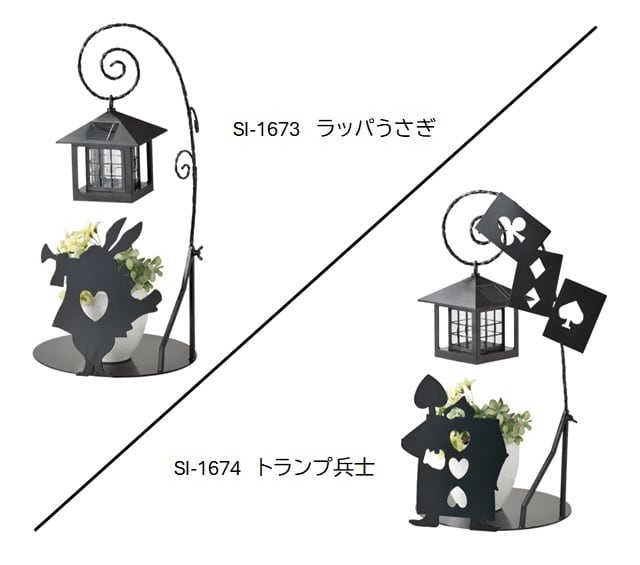 光センサーで自動点灯するこの商品は、かわいらしいラッパうさぎとトランプ兵士が描かれたシルエットデザインです。夕暮れ時に周囲が暗くなると、優しく灯りがともり、心地よい雰囲気を演出します♪